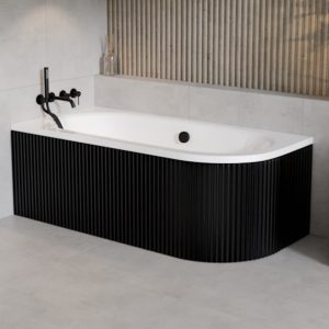 Asimetriska stūra akrila vanna ar vannas kājām.