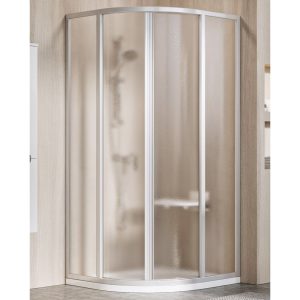 Pusapaļš dušas stūris ar abpusēji veramām durvīm.