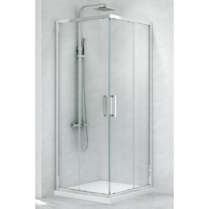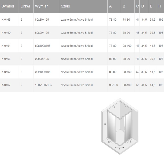 Kvadrātveida dušas stūris New Praktic K sastāv no divām 6mm biezām bīdāmām stikla durvīm. Iespējamās profilu, rokturu krāsas: hromēta. Active shield stikla pārklājums, atgrūž ūdens lāses un novērš kaļķakmens un citu nogulšņu veidošanos. Iespējama uzstādīšana bez dušas paliktņa, tieši uz grīdas. Pieejamie stikla veidi: transparent (caurspīdīgs)