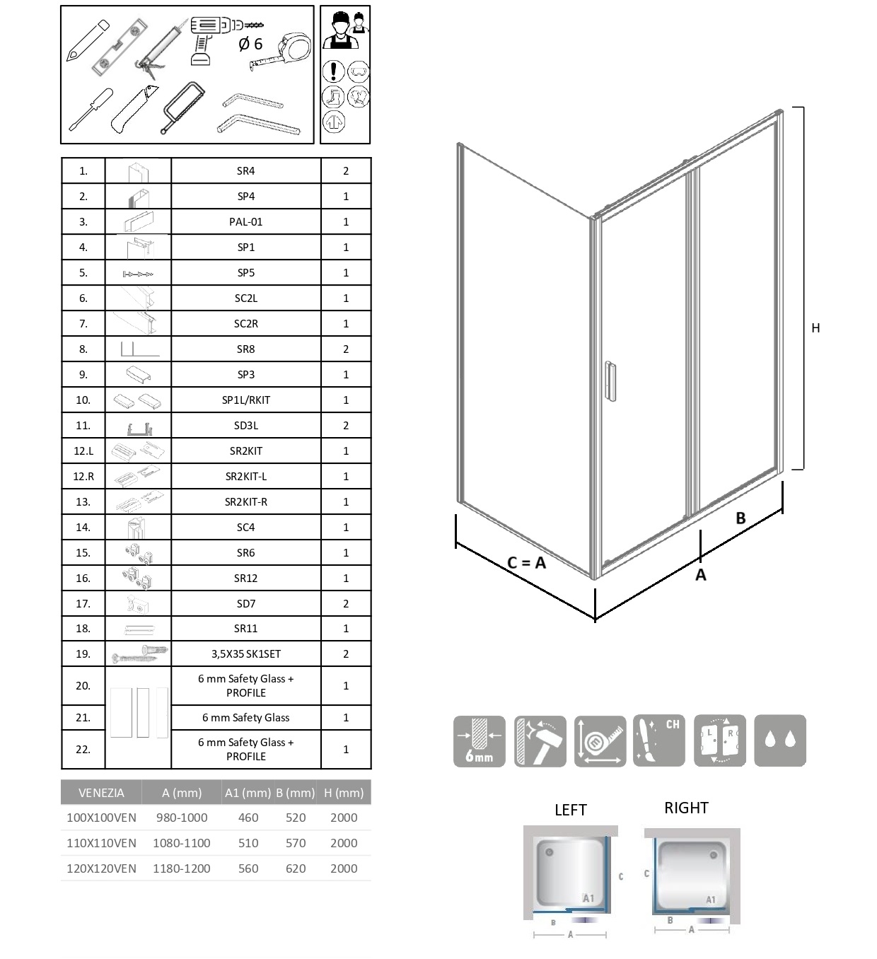 Kvadrātveida dušas stūris Venezia sastāv no vienas stacionāras 6mm biezas sienas un vienām 6mm biezām bīdāmām durvīm. Profilu, rokturu krāsa: hroms. Iespējama uzstādīšana bez dušas paliktņa, tieši uz grīdas. Pieejamie stikla veidi: caurspīdīgs, matēts, pelēks, pelēks matēts, bronza, bronza matēts. Dušas stūri ir iespējams izgatavot pēc individuāliem izmēriem. Dušas stūra profilus, rokturus iespējams pasūtīt jebkurā RAL krāsu tonī. Dušas stūris uzstādāms abpusēji ar durvīm labā vai kreisā pusē.