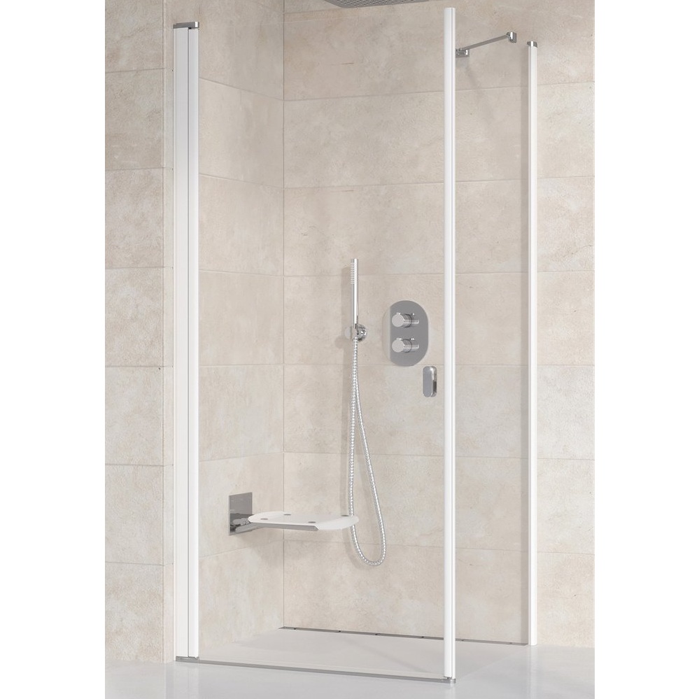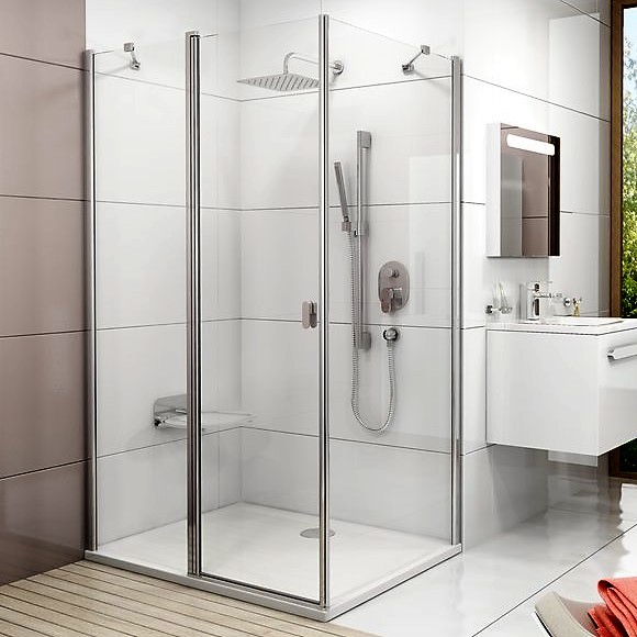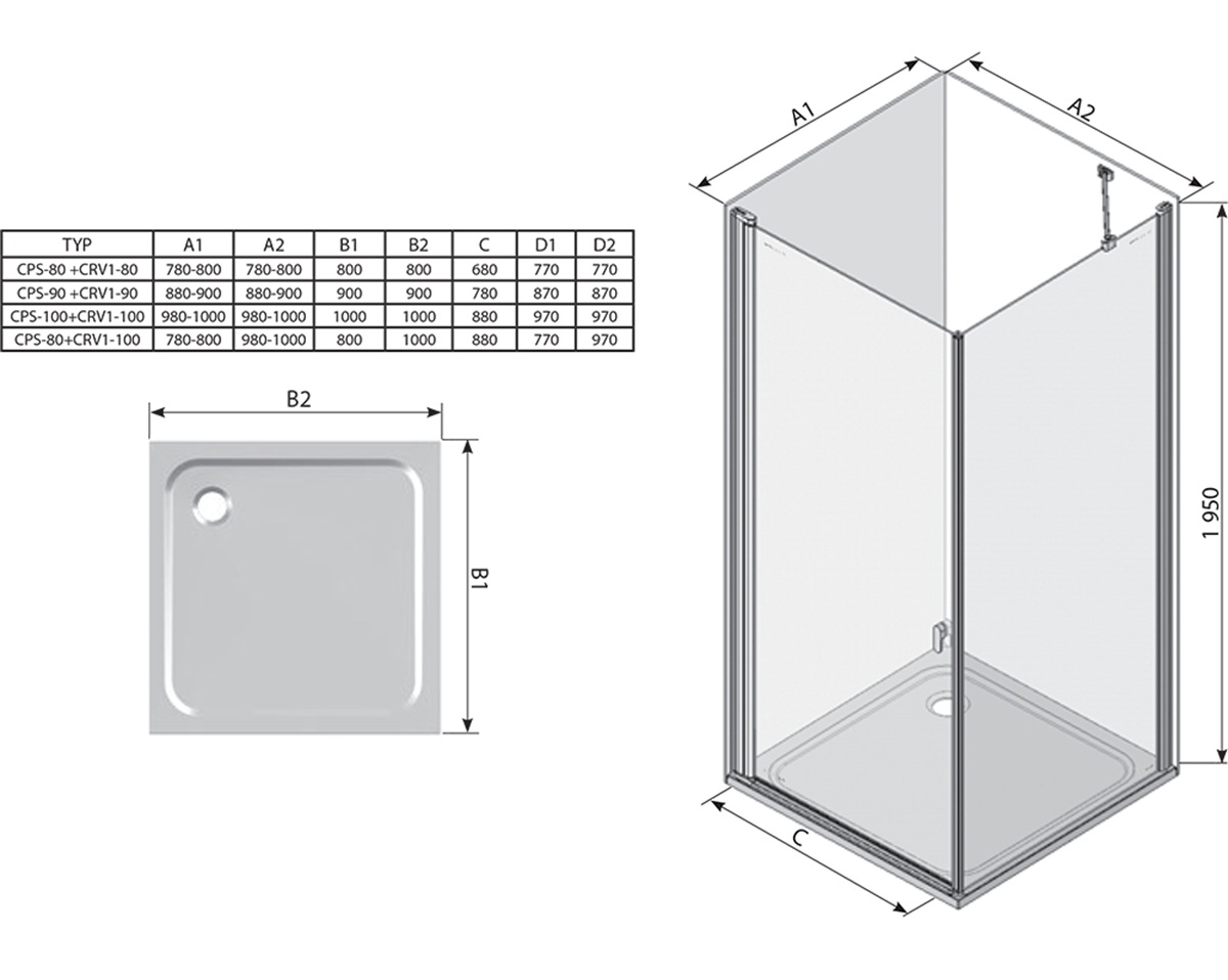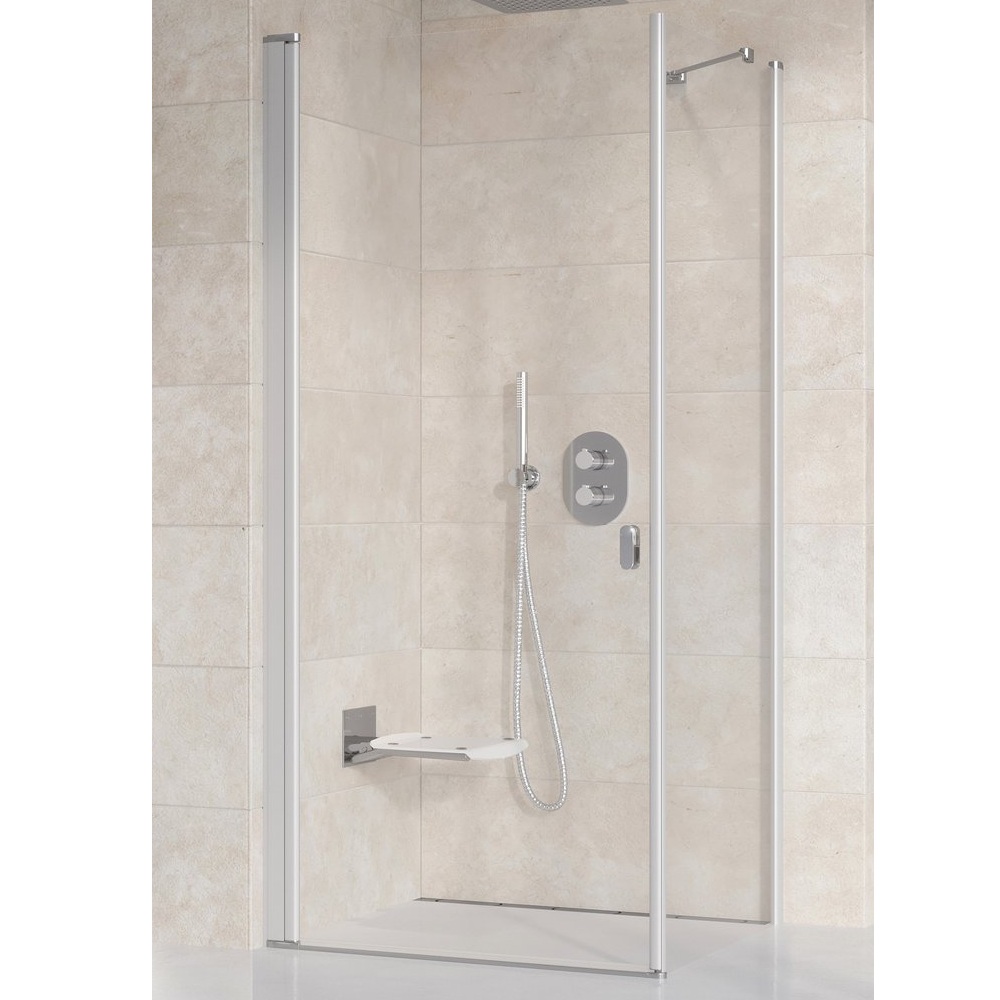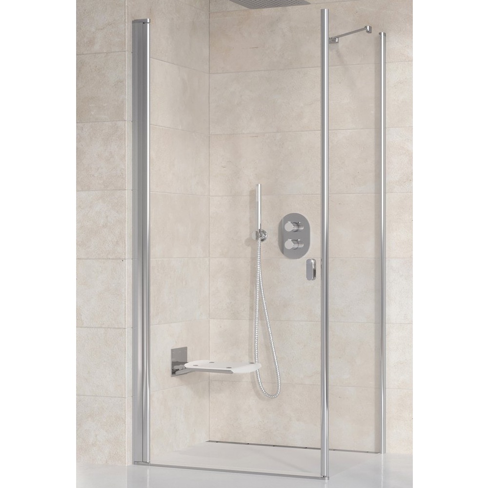 Kvadrātveida dušas stūris Chrome CRV1+CPS sastāv no vienas nekustīgas sienas un vienām 6mm biezām veramām durvīm. Iespējamās profilu, eņģu, rokturu krāsas: balta, satīna, spīdīga Anticalc stikla pārklājums atgrūž ūdens lāses un novēršot kaļķakmens un citu nogulšņu veidošanos. Iespējams uzstādīt bez dušas paliktņa, tieši uz grīdas. Pieejamie stikla veidi: transparent (caurspīdīgs)