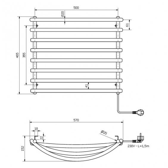Elektriskais dvieļu žāvētājs SU210 ar kabeli un rozeti. Korpuss izgatavots no tērauda, kurš speciāli apstrādāts pret korozijas iedarbību. Korpusa iekšpusē atrodas dubulti izolēts kabelis-sildelements. Aizsardzības klase IP-44. Nav nepieciešama papildus sazemēšana. Komplektā ietilpst dvieļu žāvētājs, elektriskais kabelis ar kontaktdakšu, stiprinājumi. Sildītāja jauda – 72W. Iespējamās krāsas: pelēka. Maksimālais kabeļa garums 100cm.