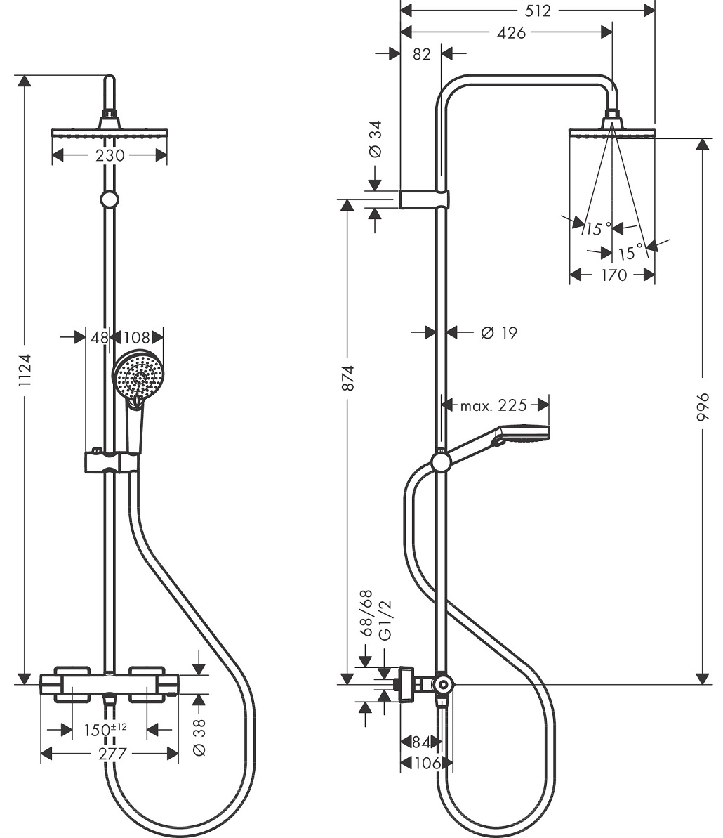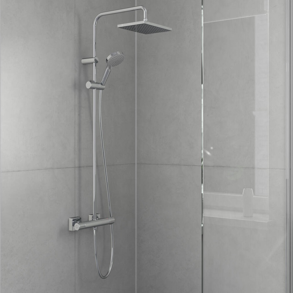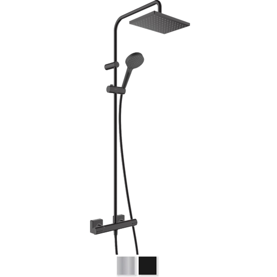Dušas sistēma Vernis Shape ar termostata ūdens maisītāju. Sastāv no termostata ūdens maisītāja, lietus dušas ar lielo dušas galvu, 2 funkciju rokas dušas, dušas pievada un rokas dušas turētāja. Termostats spēj uzturēt nemainīgu ūdens temperatūru arī tad, ja mainās ūdens spiediens caurulēs.Dušas sprauslām Anti-calc pretapkaļķošanās sistēma. Izgatavots no misiņa. Iespējamās krāsas: hromēta, melna matēta.