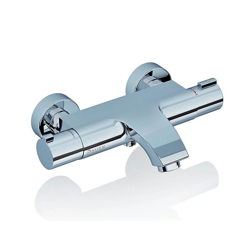 Divsviru ūdens maisītājs ar termostatu vannai, no sienas TE 082, bez dušas komplekta. Termostats uztur nemainīgu ūdens temperatūru pat strauju ūdens spiediena izmaiņu gadījumā ūdensvadā. Izgatavots no misiņa. Maisītājam ir ūdens aerators, kurš samazina ūdens patēriņu. Iespējamās krāsas: hromēts.
