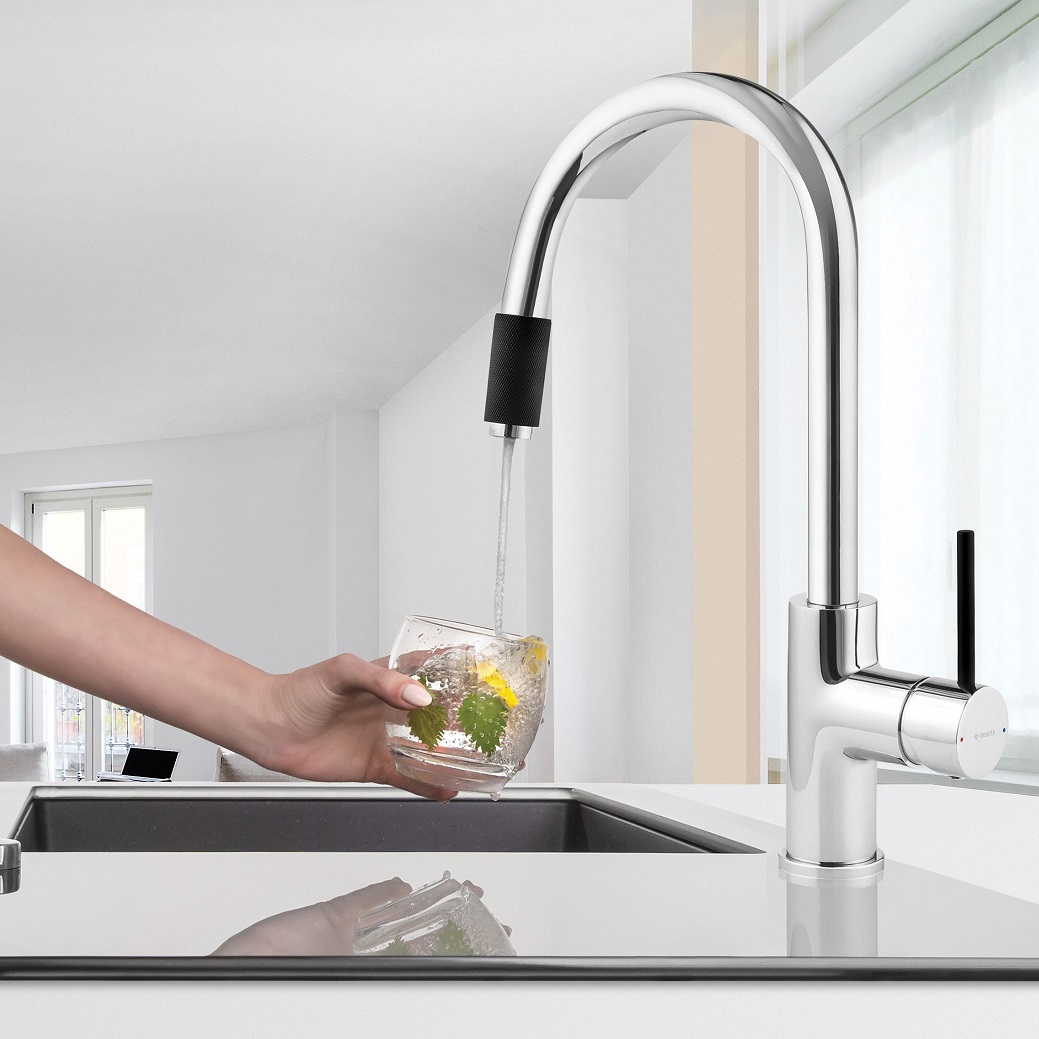 Viensviras ūdens maisītāj Aster B virtuves izlietnēm ar augsto snīpi un ūdens filtra pieslēgumu. Paredzēts lietot kopā ar dzeramā ūdens attīrīšanas iekārtu, kuru pievieno atseviķai ūdens padeves caurulei. Filtrētais ūdens tiek ieslēgts pagriežot snīpja uzgali. Komplektā ar ūdens pievadiem. Ūdens patēriņa klase – Z(ekonomiskākā) mazāk par 9 litriem/minūtē. Maisītājs aprīkots ar ūdens aeratoru, kurš samazina ūdens patēriņu. Iespējamās krāsas: hromēta, melna matēta, melna/vara.