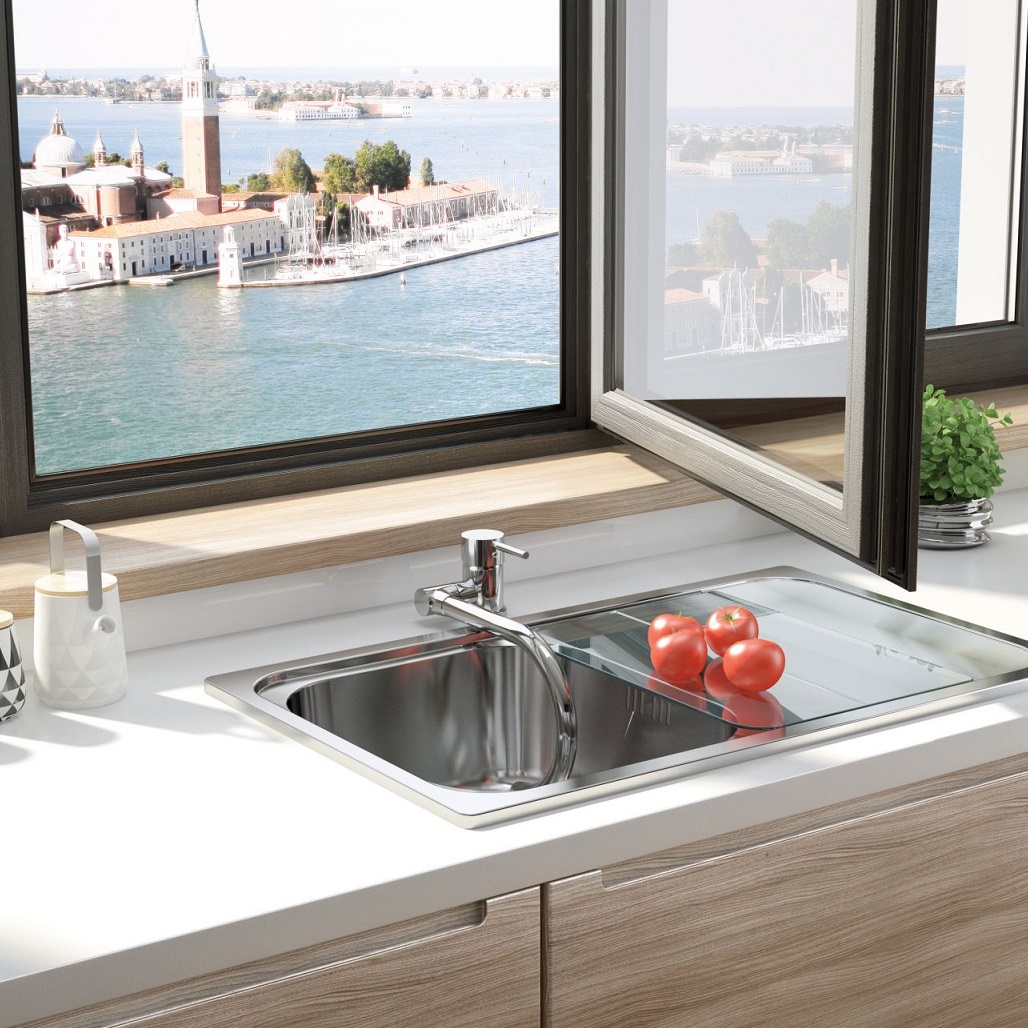 Viensviras ūdens maisītājs virtuves izlietnēm ar nolokāmu snīpi. Komplektā ar ūdens pievadiem.