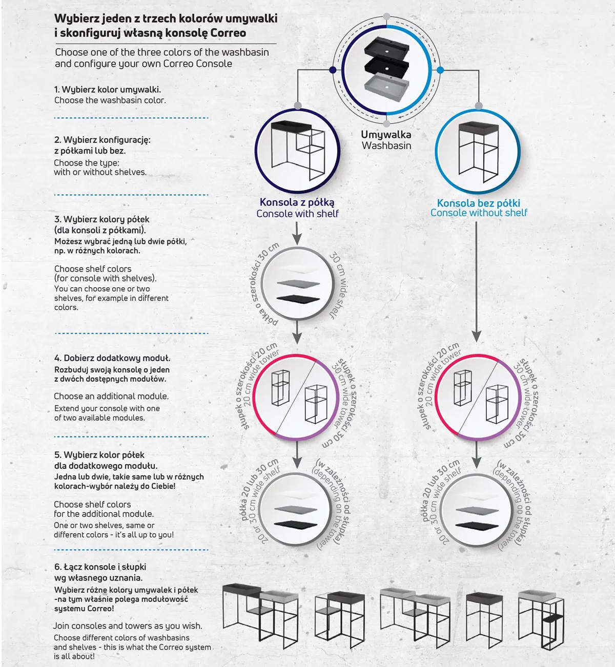 Konsole Correo 20cm, izgatavota no augstas kvalitātes nerūsējošā tērauda un krāsota ar mitrumizturīgu krāsu. Konsole paredzēta Correo sērijas plauktu virsmas montāžai. Konsole ērti kombinējama ar citām šīs sērijas konsolēm, ērtai un daudzveidīgai izlietņu un plauktu sistēmas izveidošanai. Iespējamās krāsas: melna matēta. Komplektā ietilpst konsoles montāžas komplekts un regulējamas kājas.