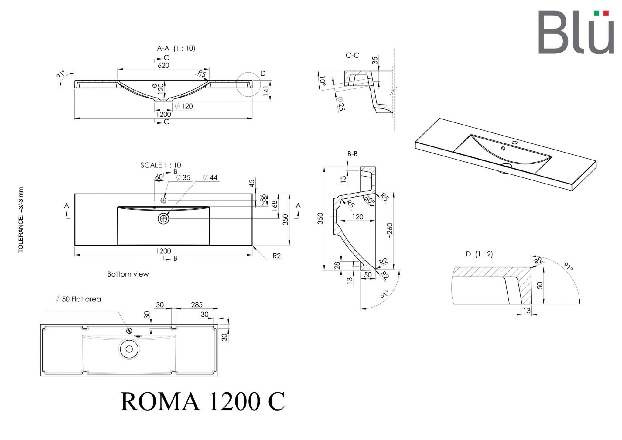 Pie sienas stiprināma marmora masas izlietne Roma ar galdu. Izgatavota no marmora pulvera un kompozītu sveķu maisījuma. Izlietnes krāsa: balta. Izlietne uzstādāma uz kronšteiniem, kuri iegādājami atsevišķi.