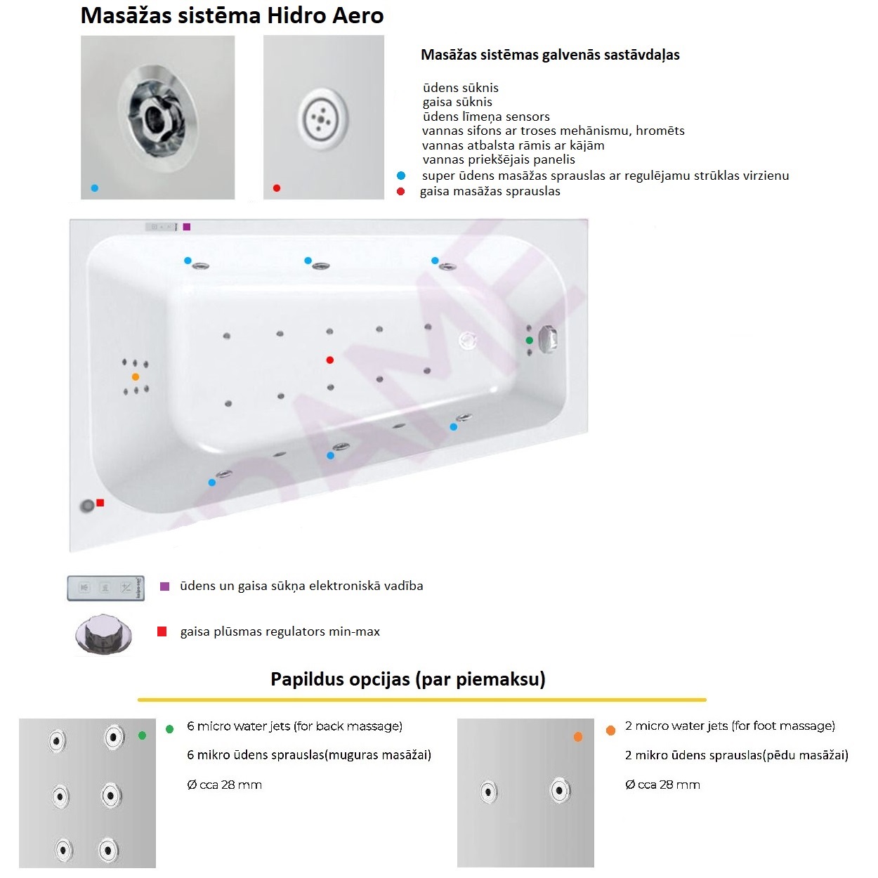 Hirdo Aero – Šī sistēma apvieno gan ūdens, gan gaisa masāžas sistēmas. Nodrošinot visu ko rada ūdens masāža plus gaisa masāža. To mijiedarbības efekts lieliski atslābina cilvēka organismu un rezultātā nodrošina pilnīgu spēku atjaunošanos. Gaisa masāžas sistēma ir balstīta uz gaisa spiedienu, ko rada gaisa sūknis. Rezultātā caur gaisa sprauslām plūst spēcīga saspiestā gaisa plūsma ar miljoniem sīku gaisa burbuļu, kas sajaucas ar ūdeni un pārvietojas lielā ātrumā. Šāda burbuļu kinētiskā enerģija, nodrošina spēcinošu visa ķermeņa masāžu.