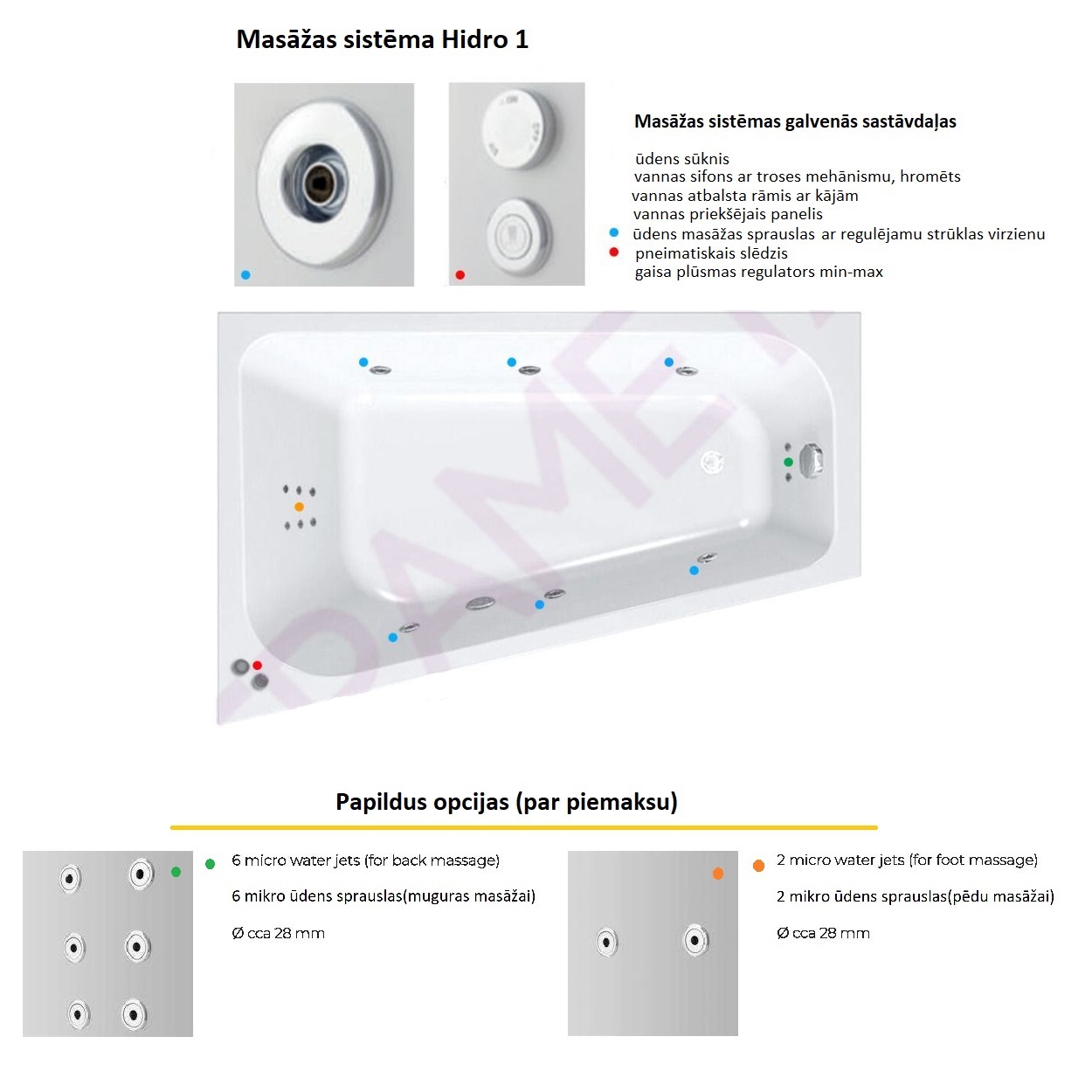 Masāžas sistēmām Hirdo 1 un Hidro Aero papildus iespējams izvēlēties muguras un pēdu masāžas sprauslas.