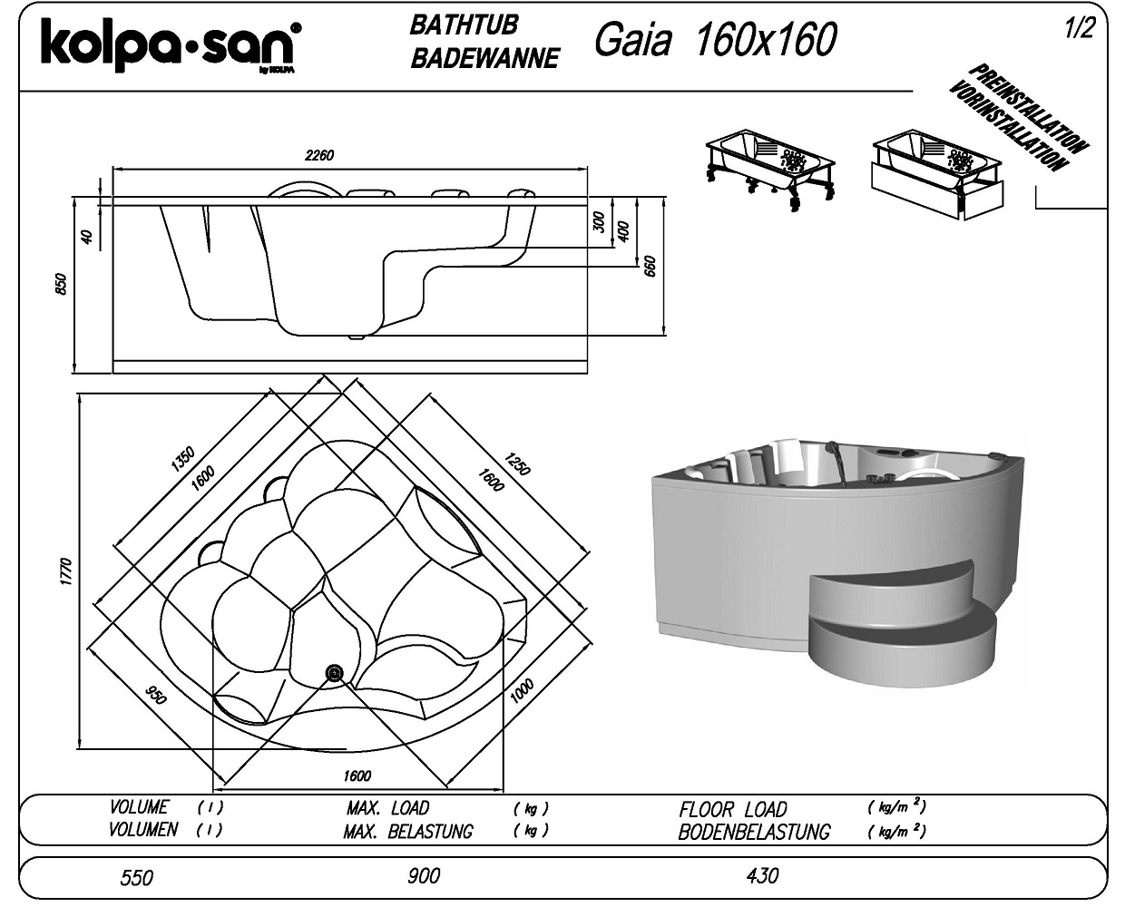 Akrila stūra vanna Gaia, izgatavota no sanitārā lietā akrila, kurš nodrošina vienmērīgu akrila biezumu pa visu vannas virsmu. Vanna pastiprināta ar stikla šķiedras audumu un epoksīda sveķu slāni. Komplektā ietilpst vanna, Vital masāžas sistēma, vannas kājas, vannas sifons, ūdens maisītājs uz vannas malas. Iespējamās masāžas sistēmas: Vital. Vannai Gaia iespējama komplektācija: bez priekšējā paneļa (iebūvējama), ar priekšējo paneli. Iespējamie ūdens maisītāji: Waterfall, Geyser.