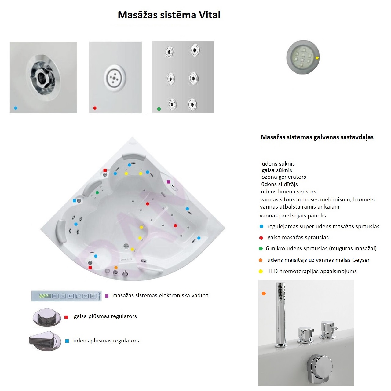 Vital – Šī sistēma apvieno gan ūdens, gan gaisa masāžu ar visām papildus iespējām, kura sniedz vispilnīgāko ūdens procēdūru baudījumu. Šī ir ne tikai masāža bet vesela terapija, kuru nodrošina gan zemūdens gaismas iedarbība, gan ozona ģenerators bagātinot ūdeni ar ozoa gaisa burbuļiem, apvienojumā ar muguras masāžas sprauslām.