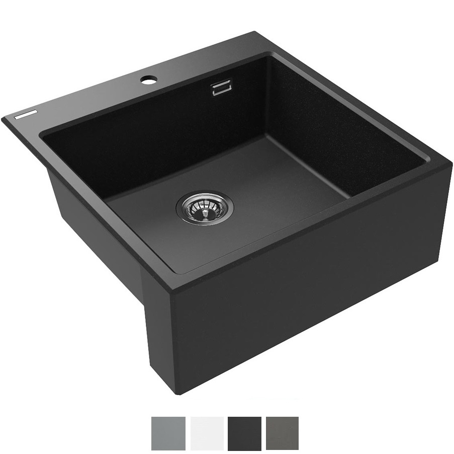 Akmens masas izlietne Eridan Farmhouse, iegriežama galda virsmā no augšas. Izgatavota no granīta pulvera, kurš bagātināts ar sudraba joniem un īpašu sveķu maisījuma, tas nodrošina antibakteriālas īpašības, ideālu cietības un elastības apvienojumu. Izlietne izturīga pret skrāpējumiem, triecieniem, augstām temperatūrām, izbalēšanu, traipu veidošanos. Iespējams izvēlēties šādas krāsas: grafīta, melna, alabastra, pelēka, antracīta. Komplektā ietilpst: stiprinājumi, sifons, automātiskais klik-klak izplūdes korķis.