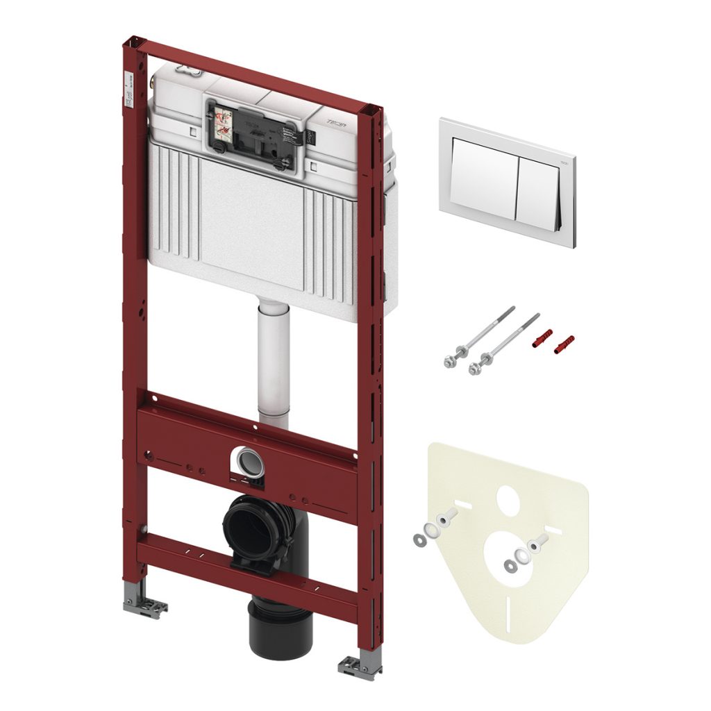Iebūvējama skalojamā kaste ar tērauda rāmi TeceBase, komplektā ar pogu, pie sienas piekaramiem podiem. Paredzēts montāžai pie nesošas sienas vai ģipškartona konstrukcijas. Rāmja slodzes izturība – 400 kg. Komplektā ietilpst: izolēta skalojamā kaste, regulējams nesošais rāmis, rāmja stiprinājumi pie sienas, poda pieslēglīkums, skaņas izolācijas blīve, poda stiprinājumi, dubultās skalošanas poga. Skalošanas pogai iespējamās krāsas: balta, hromēta.